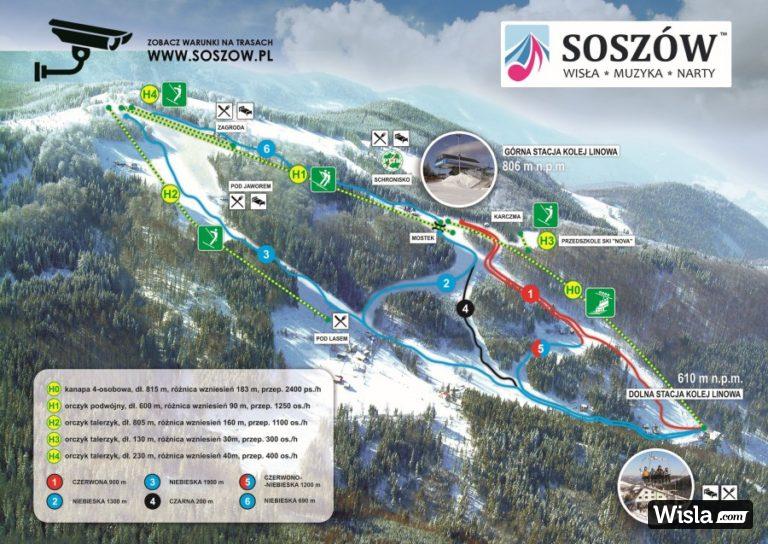 Stacja Narciarska Soszów w Wiśle jest jedną z największych stacji narciarskich w Beskidach a stok narciarski Soszów to najbardziej urozmaicony i największy teren narciarski w Wiśle. Ten nowoczesny ośrodek, którego dolna stacja kolei linowej położona jest na wysokości 610 m n.p.m. wyróżniają bardzo dobre warunki na trasach narciarskich o łącznej długość ponad 6 km. Czteroosobowa kolej linowa oraz 4 wyciągi narciarskie, wywożą narciarzy i snowboardzistów do miejsc, skąd mogą wybierać spośród 6 zróżnicowanych tras narciarskich. Zimą kolej jest czynna do godziny 21:30 (sezon niski do 21.00). Specyficzny mikroklimat oraz wysoka pokrywa śniegowa, pozwalają na jazdę nawet do końca kwietnia. Przy ośrodku usytuowane są parkingi na kilkaset samochodów, które w godz. 7.00 – 23.00 są bezpłatne.